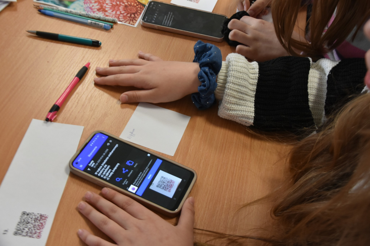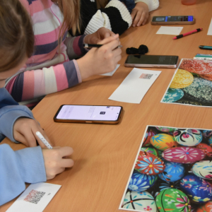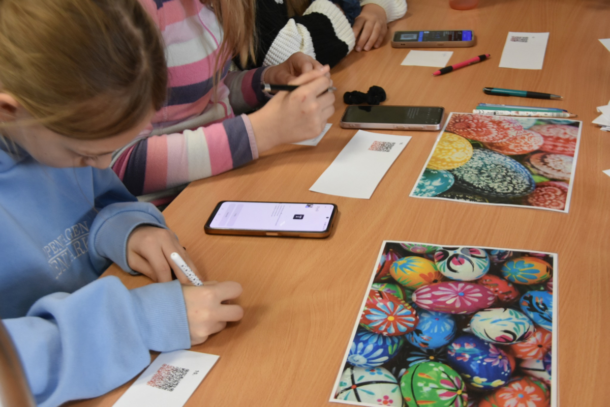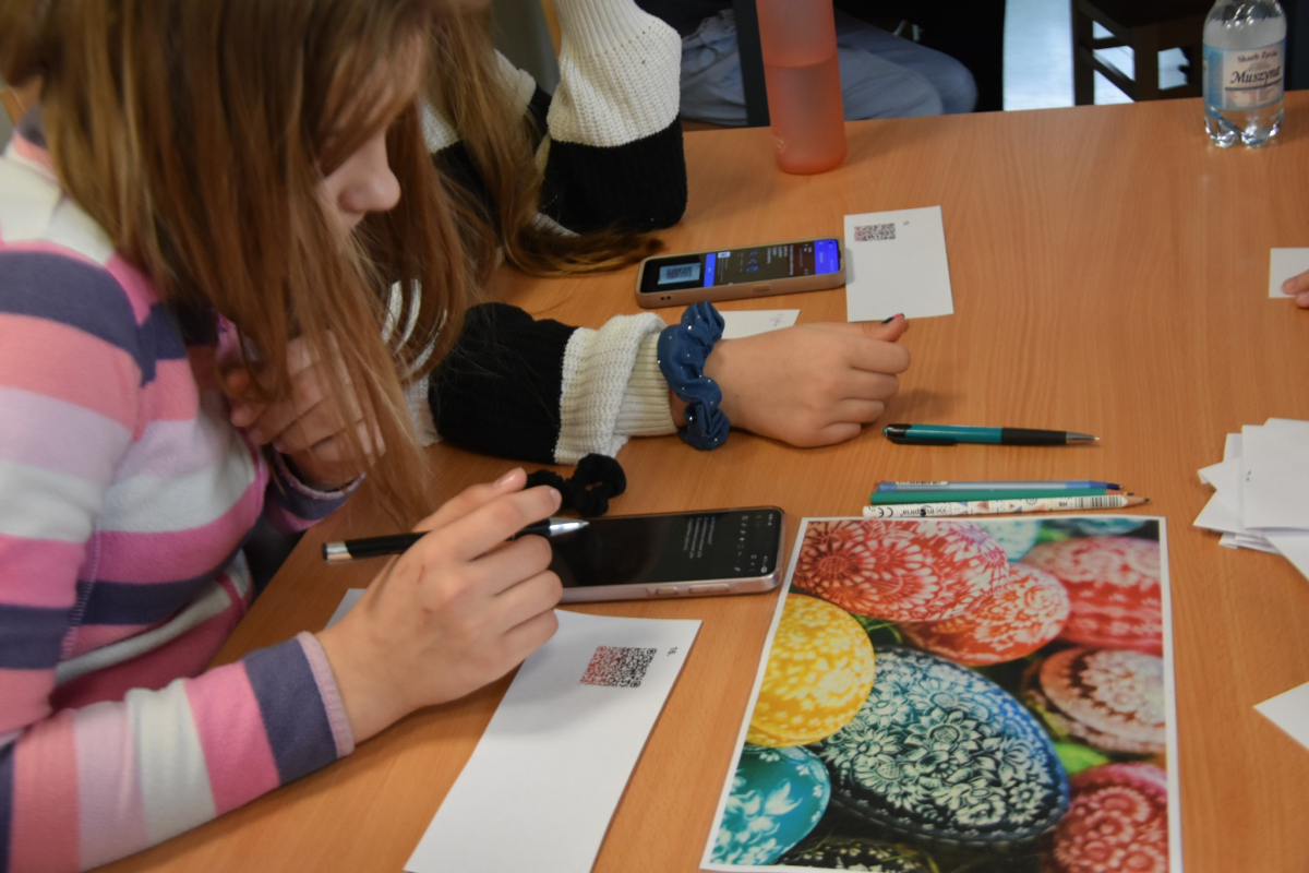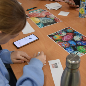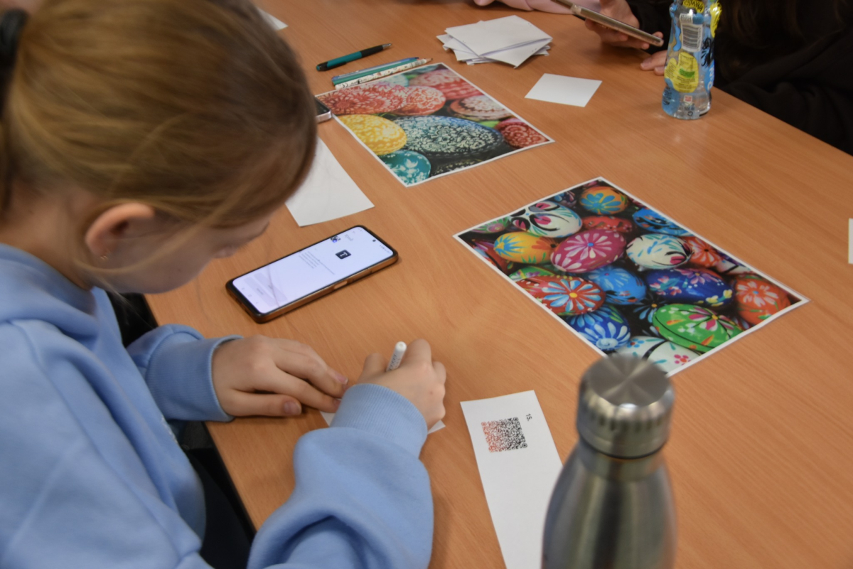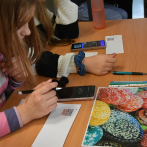 Każdy uczestnik zajęć mógł osobiście nanieś wosk na jajko i stworzyć kwiatuszki i kropeczki, aby następnie zanurzyć je w farbie. Efekt po malowaniu?.. woooow! Test sprawdzający wiedzę o Wielkanocy ukryliśmy w kodach QR który z łatwością dzieci rozszyfrowały i poprawnie odpowiedziały. Brawo!