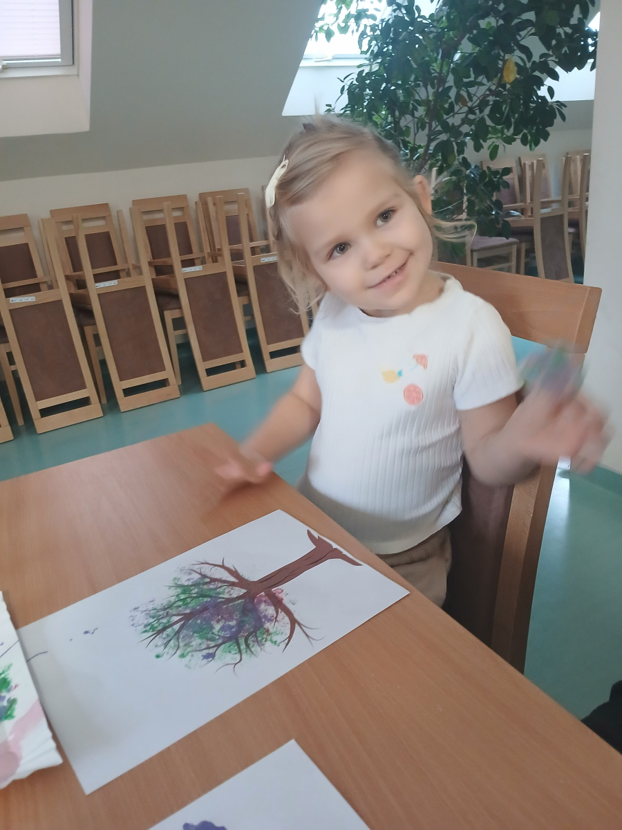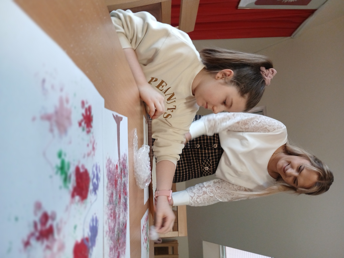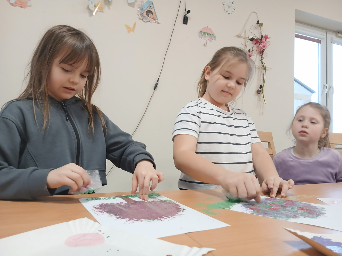 Tworzyliśmy przepiękne, barwne drzewka, wykorzystując farby oraz folię bąbelkową. Było przy tym mnóstwo śmiechu, kreatywnych pomysłów i oczywiście… pękających bąbelków! Każde drzewko było inne i wyjątkowe – zupełnie jak jego autor.