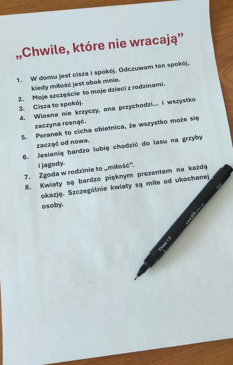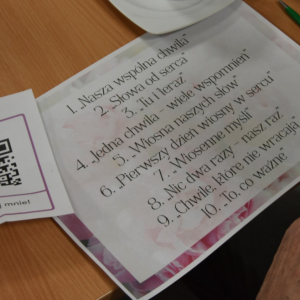Nie zabrakło także miejsca na twórczość własną. Uczestniczki, pracując z wykorzystaniem kodów QR, tworzyły zdania i skojarzenia, które następnie połączone zostały w jeden wspólny utwór. Zwieńczeniem tej części było wyłonienie – w drodze głosowania – tytułu dla powstałego tekstu. Najwięcej głosów zdobyła propozycja „Chwile, które nie wracają”, oddająca charakter i nastrój stworzonej pracy.