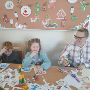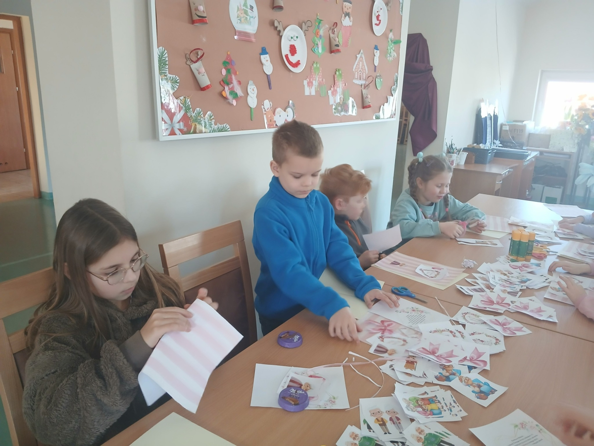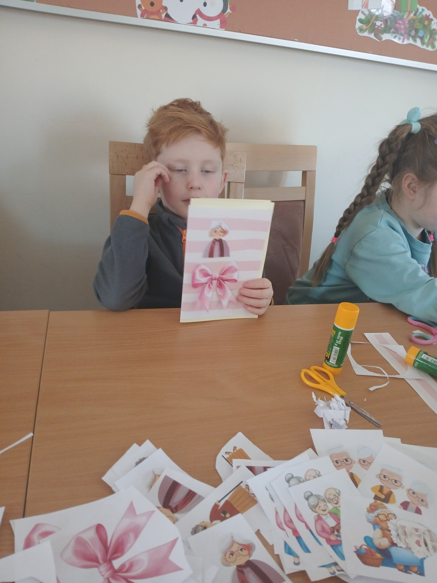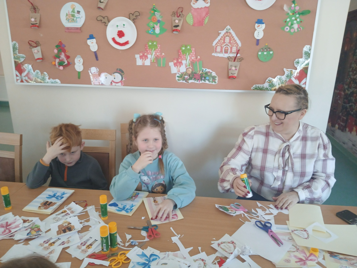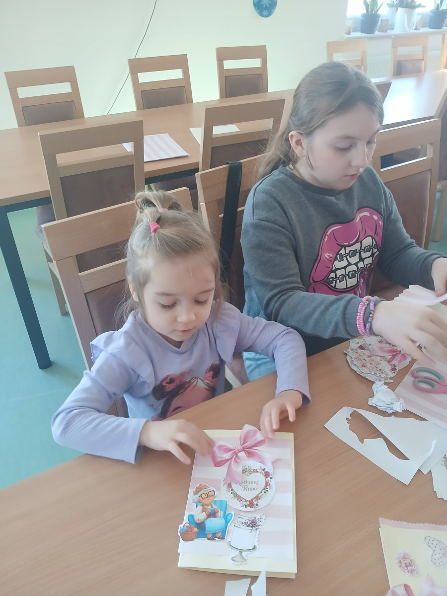 Na dzisiejszych zajęciach „Ferie pełne zabawy w GCBiK w Iwaniskach” było bardzo kolorowo i radośnie! Dzieci z ogromnym zaangażowaniem wykonywały piękne laurki z okazji nadchodzącego Dnia Babci i Dziadka, wkładając w nie dużo serca i uśmiechu.