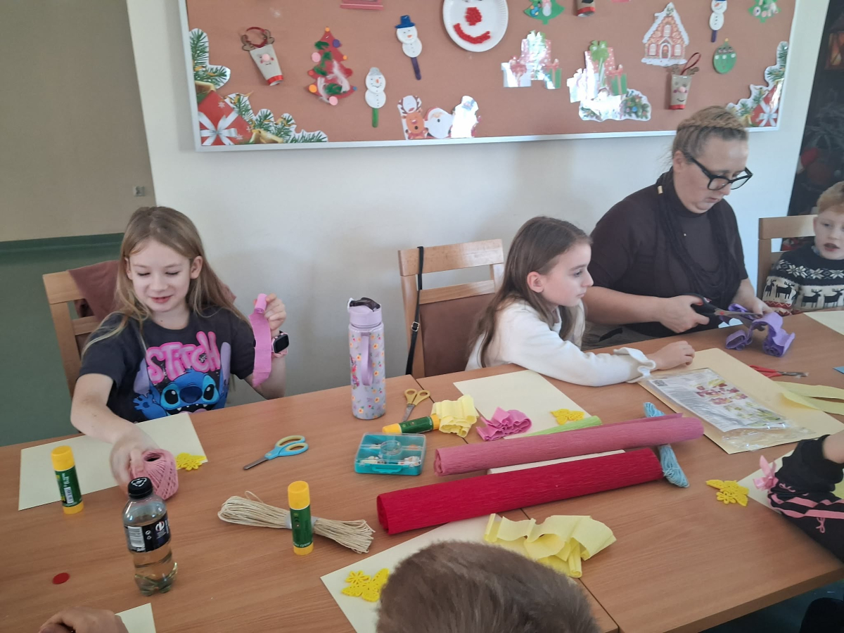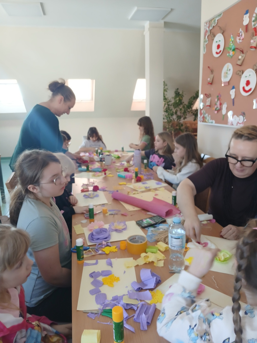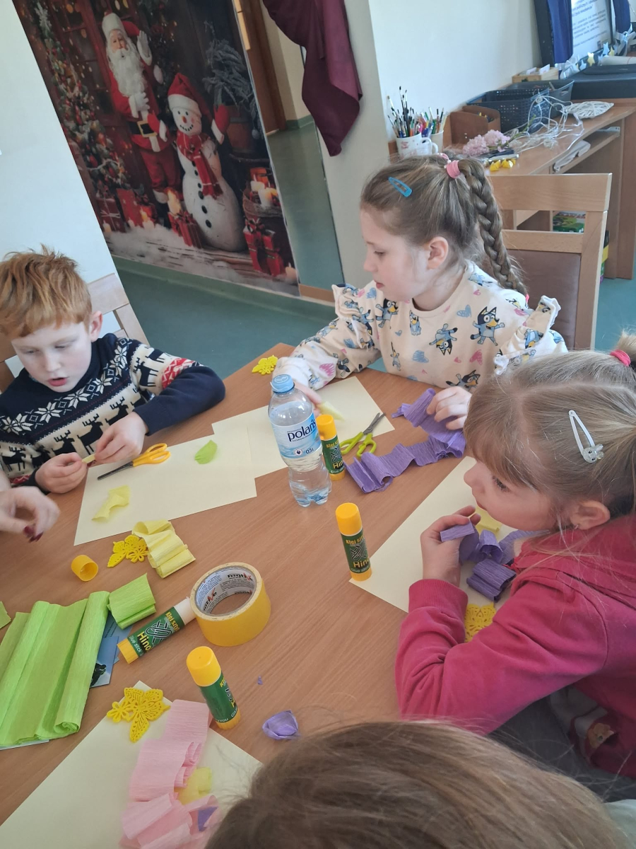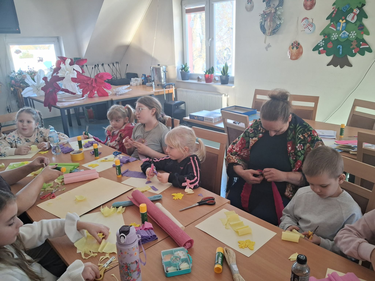 Podczas zajęć pod hasłem „Ferie pełne zabawy z GCBiK w Iwaniskach”, wspólnie z panią Ewą - przewodniczącą z Koła Gospodyń Wiejskich w Przepiórowie, daliśmy się ponieść kreatywnej zabawie. Powstały kolorowe, radosne kwiaty, które wprowadziły prawdziwie wiosenny nastrój