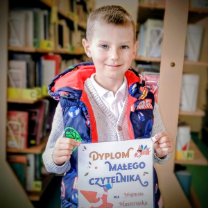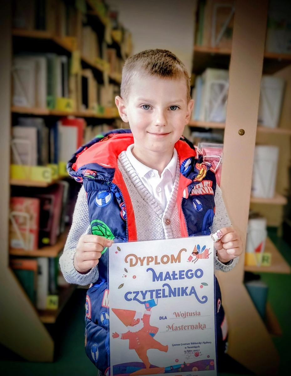 Brawo dla Wojtusia za zdobycie Dyplomu Małego Czytelnika Gratulacje od bibliotekarzy i fotka na pamiątkę. Spełnienie wszystkich warunków programu to wspólny sukces dziecka i rodziców. Bowiem 20 minut czytania dziennie-codziennie, wystarczy, aby efekty rozwoju dziecka były nadzwyczajne. To dzięki rodzicom dzieci docierają do naszej instytucji, za co im bardzo serdecznie dziękujemy. Dzieciom życzymy wspaniałych niezapomnianych przygód z bohaterami książek i zapraszamy do nas codziennie od 8.00 do 16.00.