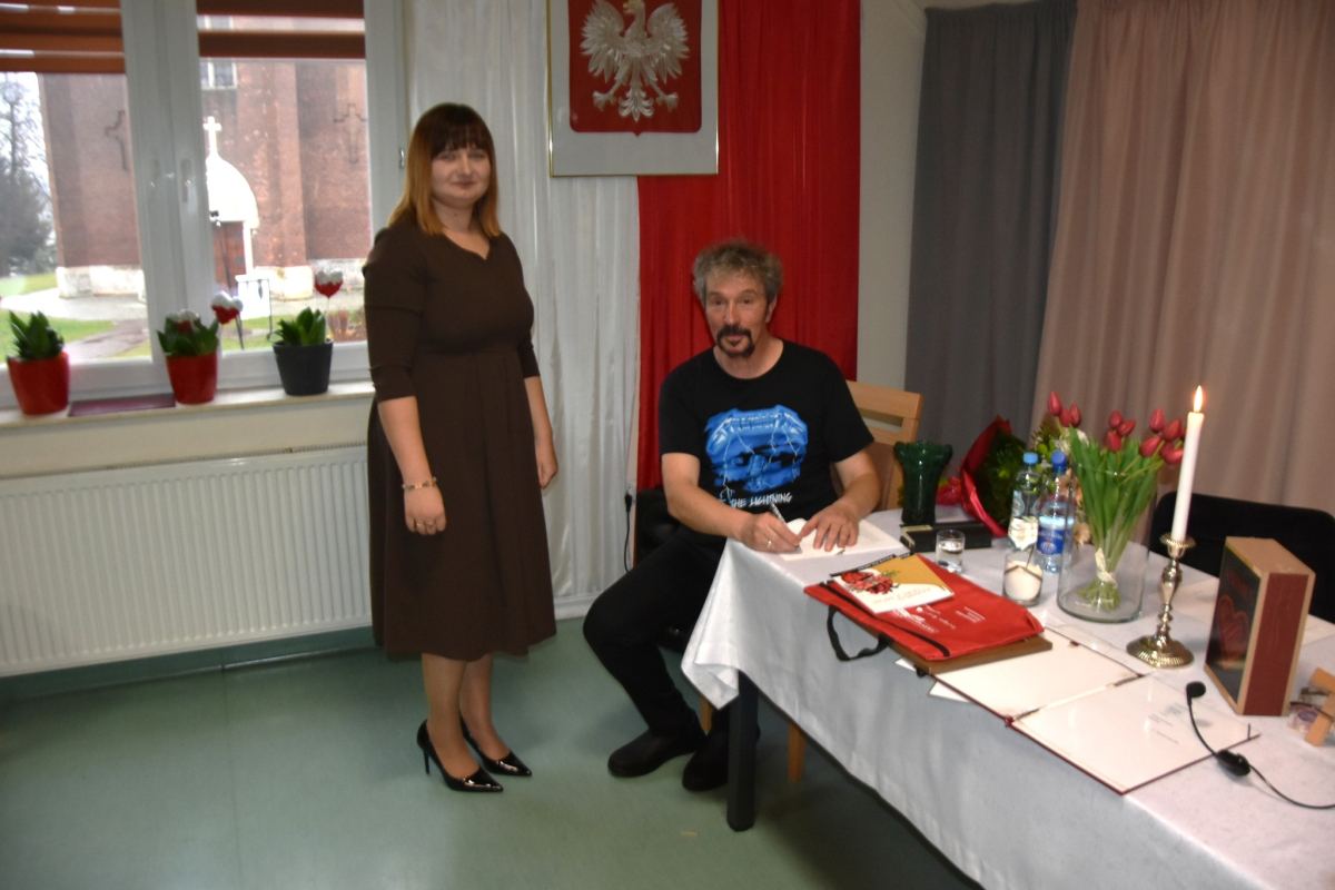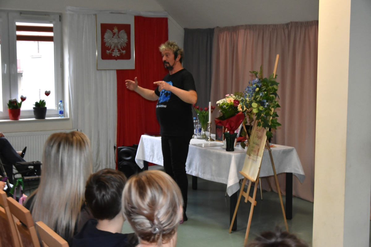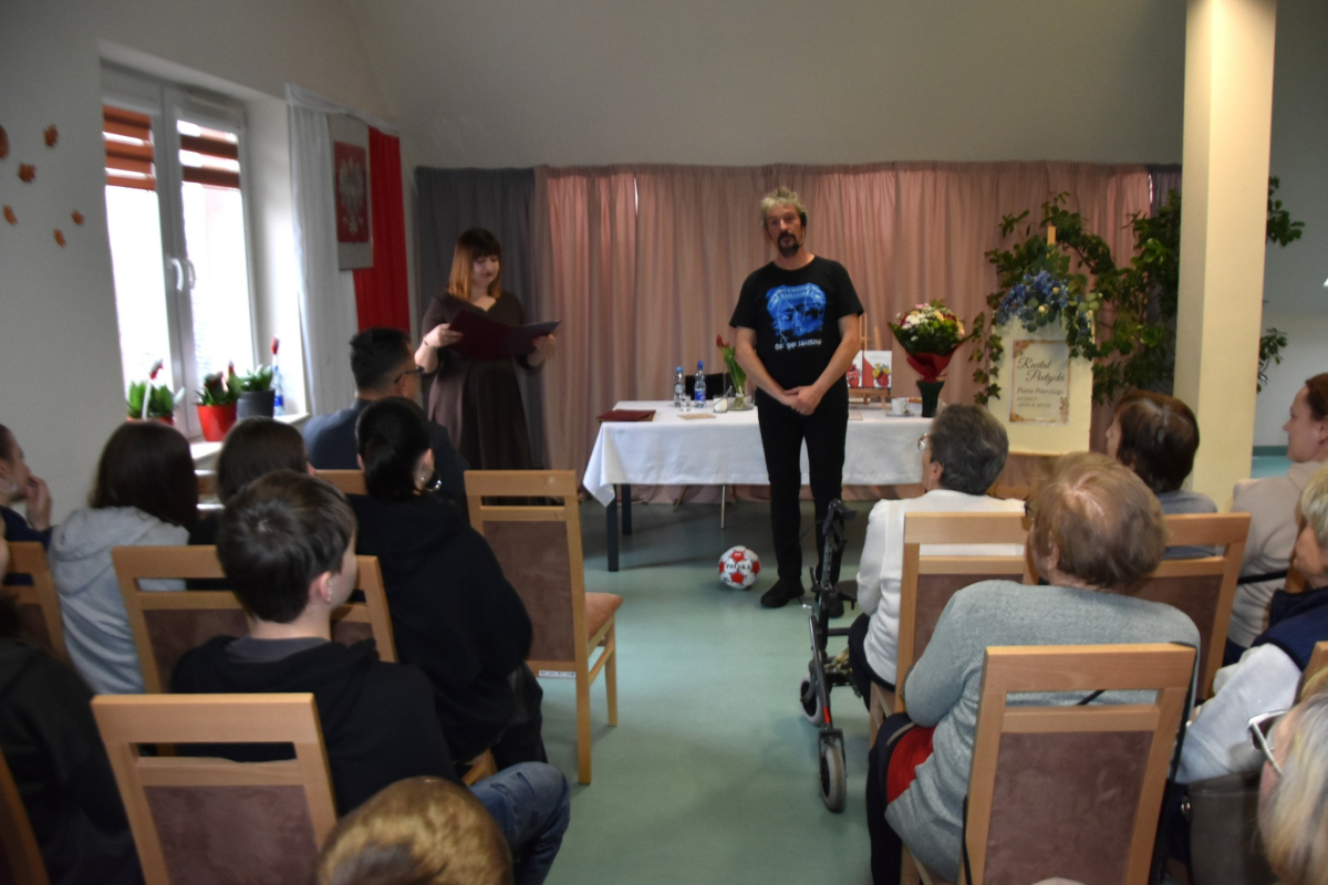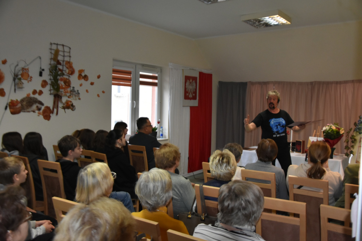 Dzisiejsze spotkanie w Gminnym Centrum Biblioteki i Kultury w Iwaniskach było prawdziwą ucztą dla ducha. Wydarzenie rozpoczęła Dyrektor – Pani Dominika Kaptur, która serdecznie powitała wszystkich gości, uczestników oraz naszego wyjątkowego artystę – Piotra Pilarskiego, aktora, poetę i mistrza słowa mówionego.