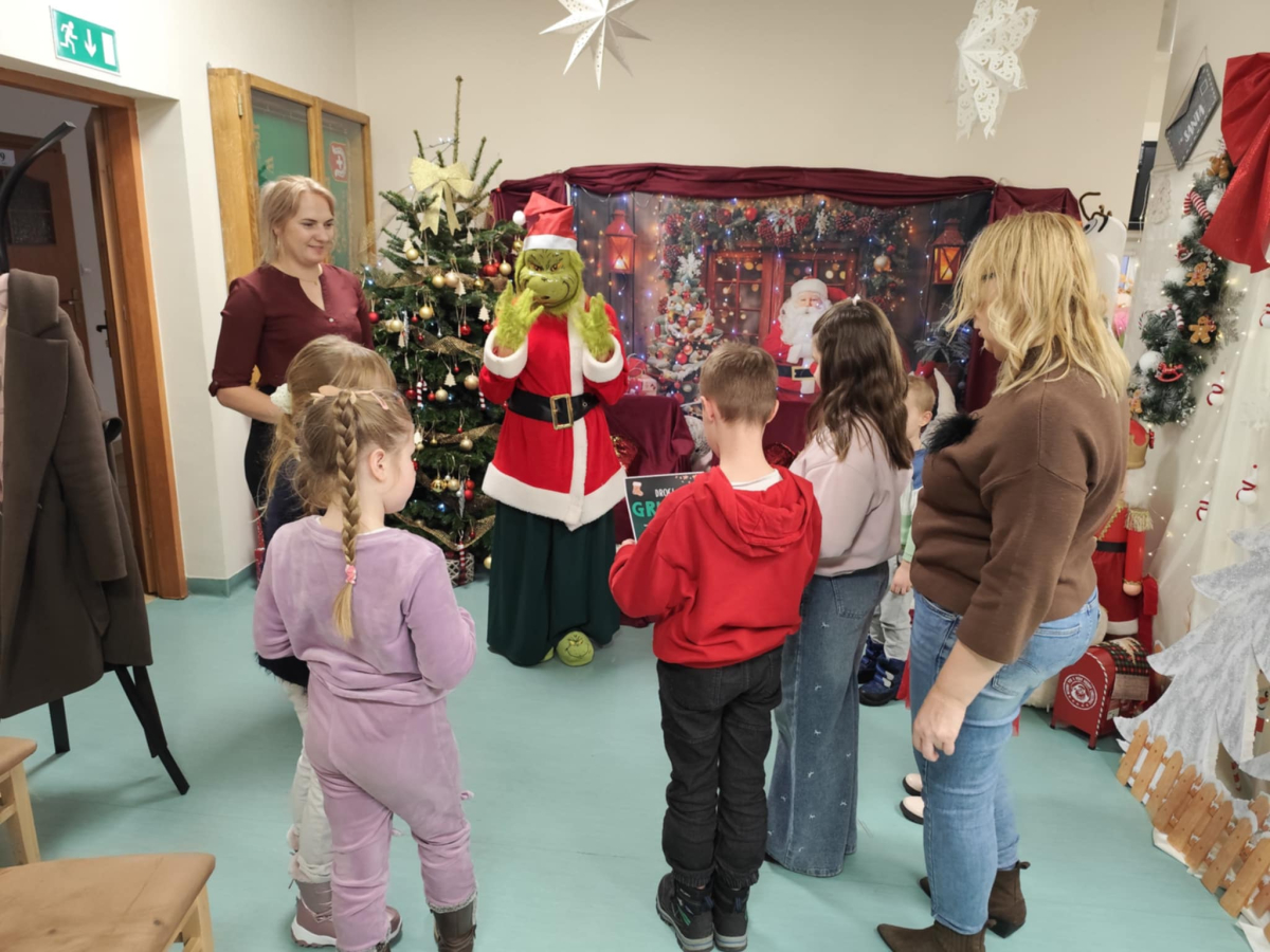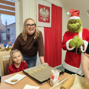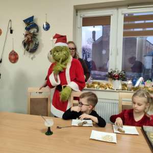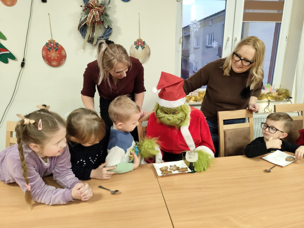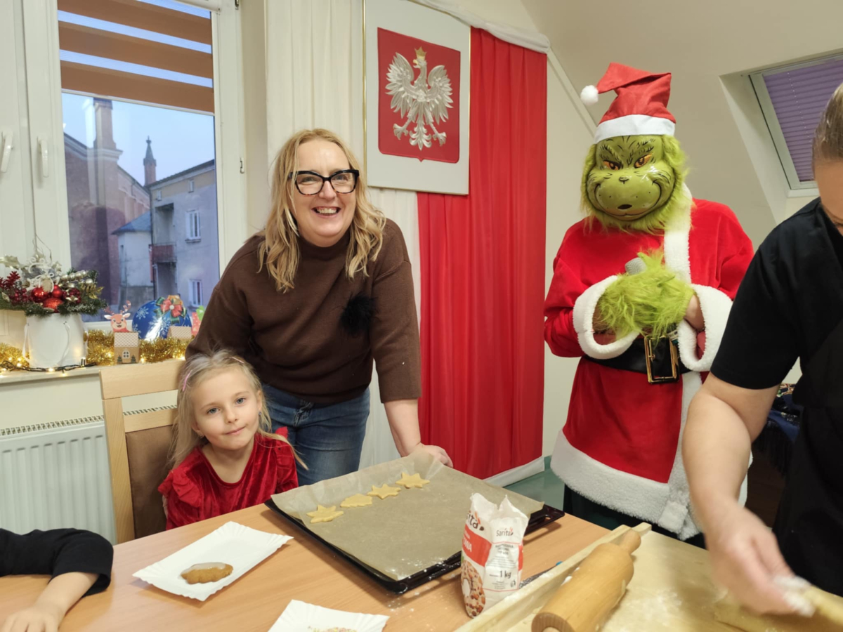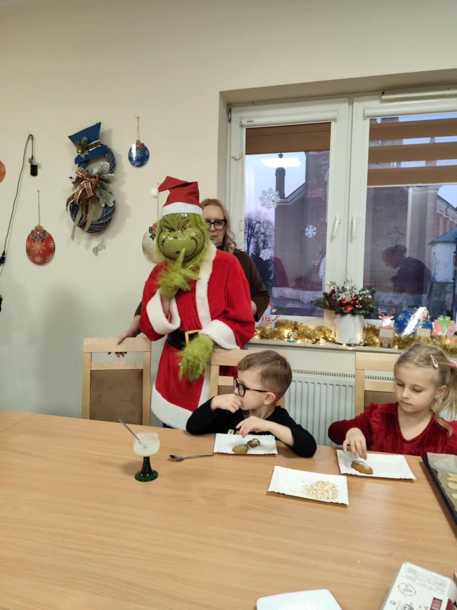 w Przepiórowie mieliśmy okazję piec pierniczki, które od samego początku wzbudziły ogromne zainteresowanie uczestników. Każdy z wielkim zaangażowaniem wałkował ciasto, wykrawał świąteczne kształty. Zapach świeżo upieczonych pierniczków był tak kuszący, że odwiedził nas nawet specjalny gość – sam GRINCH!!! Choć początkowo nie był on przekonany do świąt, dzieci szybko przekonały go, że święta są wspaniałe, pełne radości i wspólnego ciepła. Grinch uległ zapewnieniom dzieci i udekorował z nimi pierniczki.