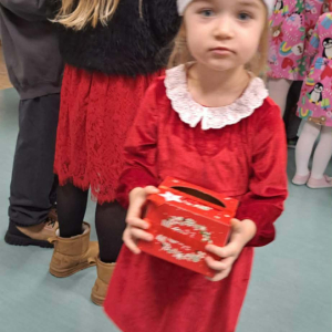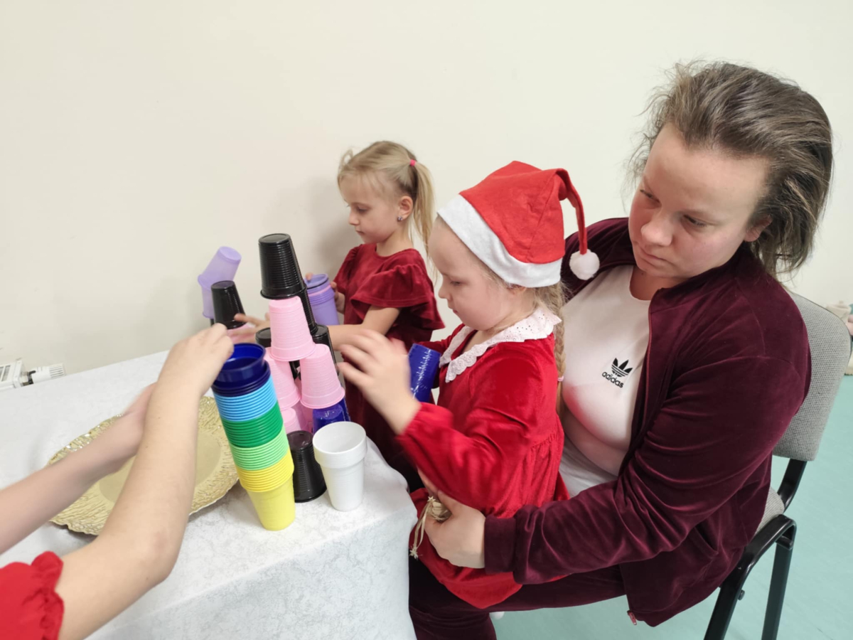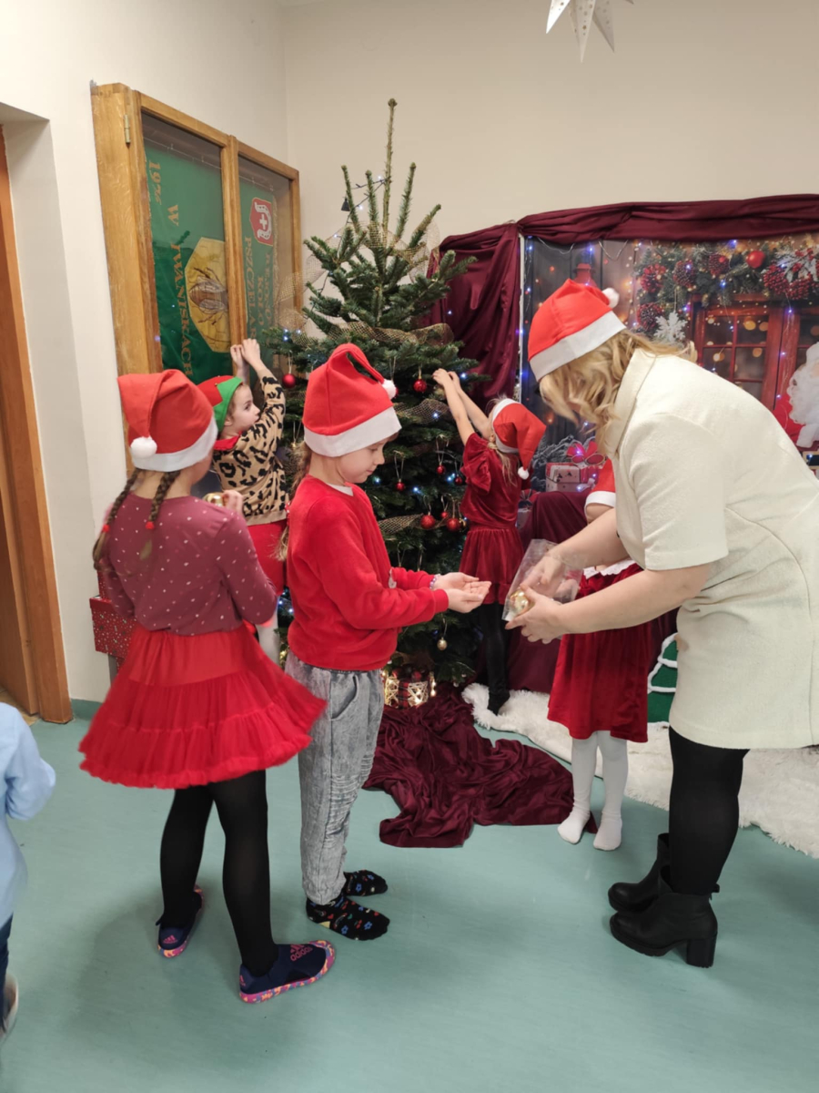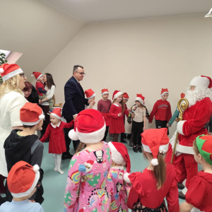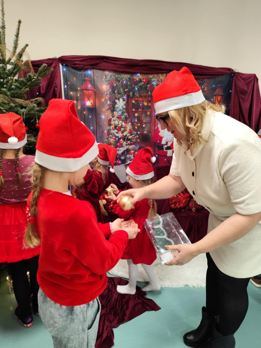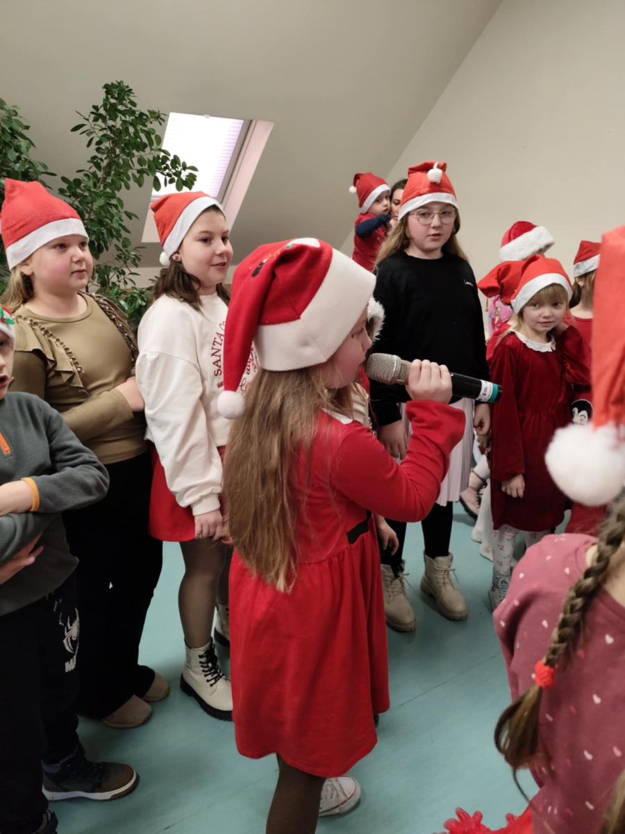 Dzieci przygotowały dla Mikołaja wzruszającą niespodziankę – zaśpiewały specjalnie dla niego świąteczną piosenkę. W tym samym czasie wspólnie wszyscy tańczyliśmy w kółku, tworząc piękny, pełen radości krąg świątecznej energii. Ten moment był prawdziwym sercem całego spotkania!
