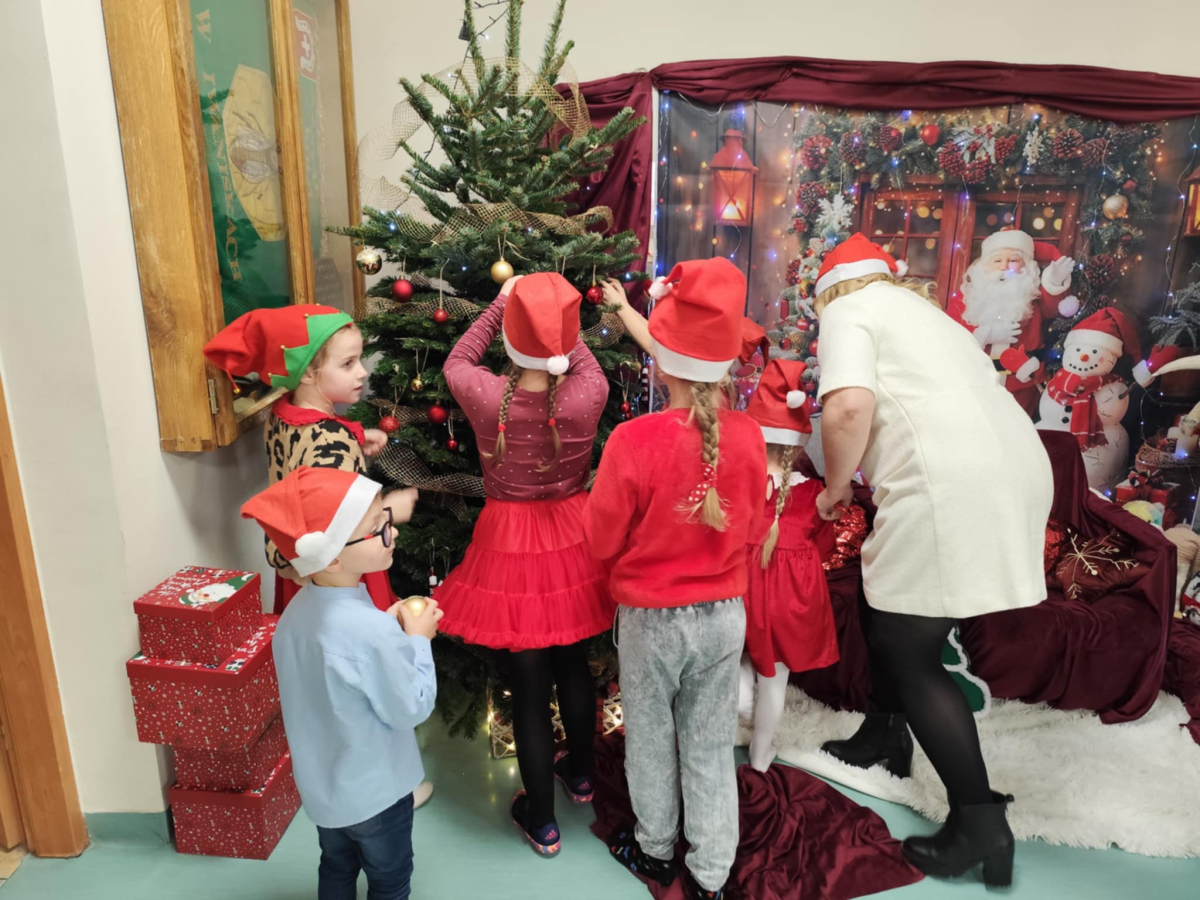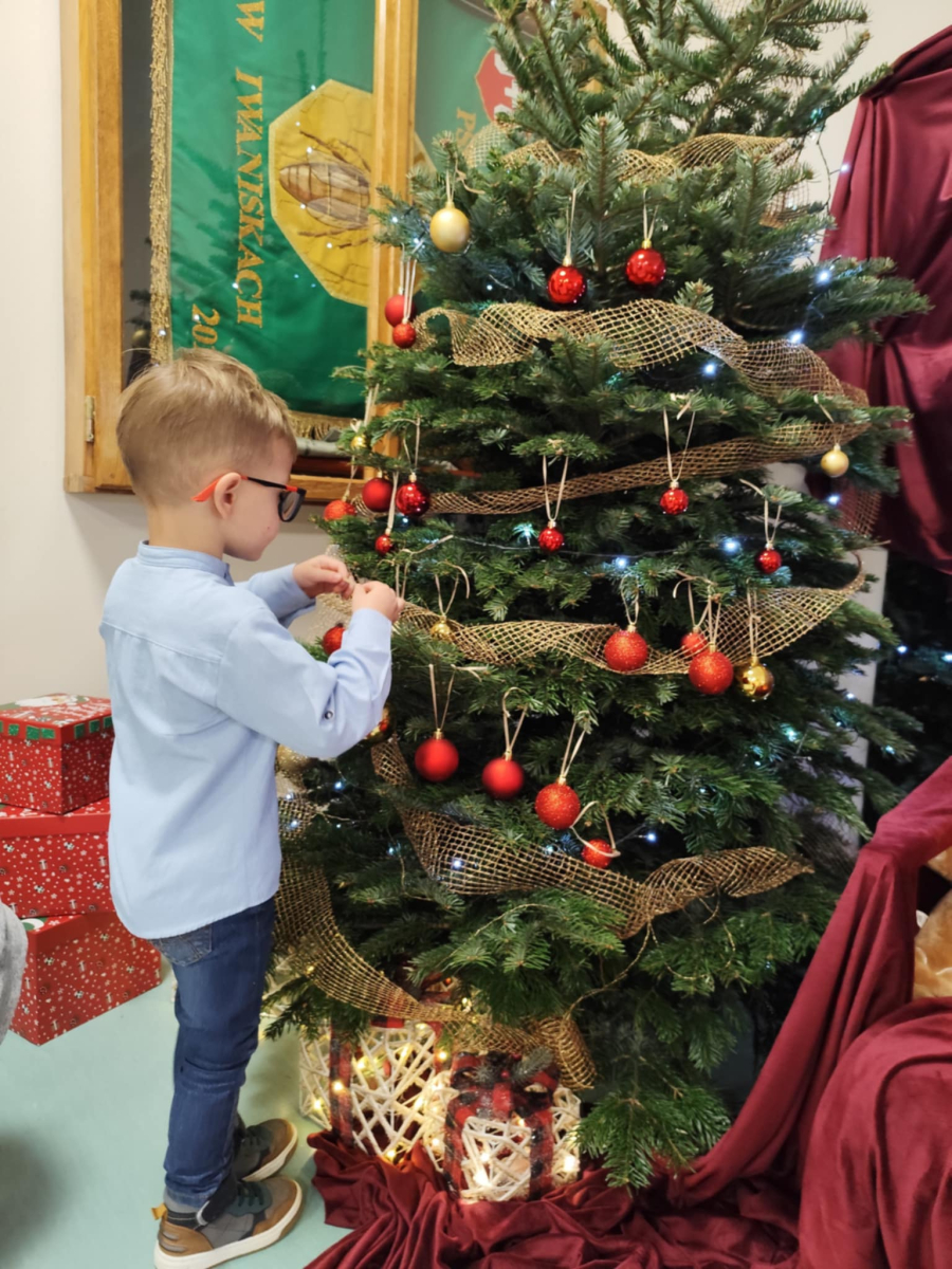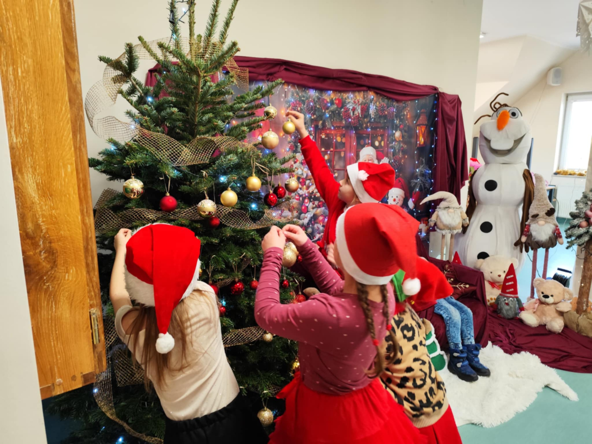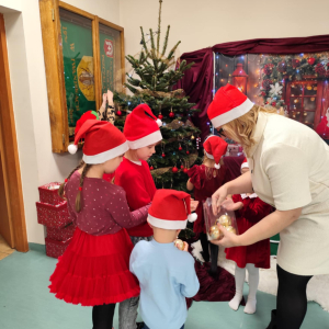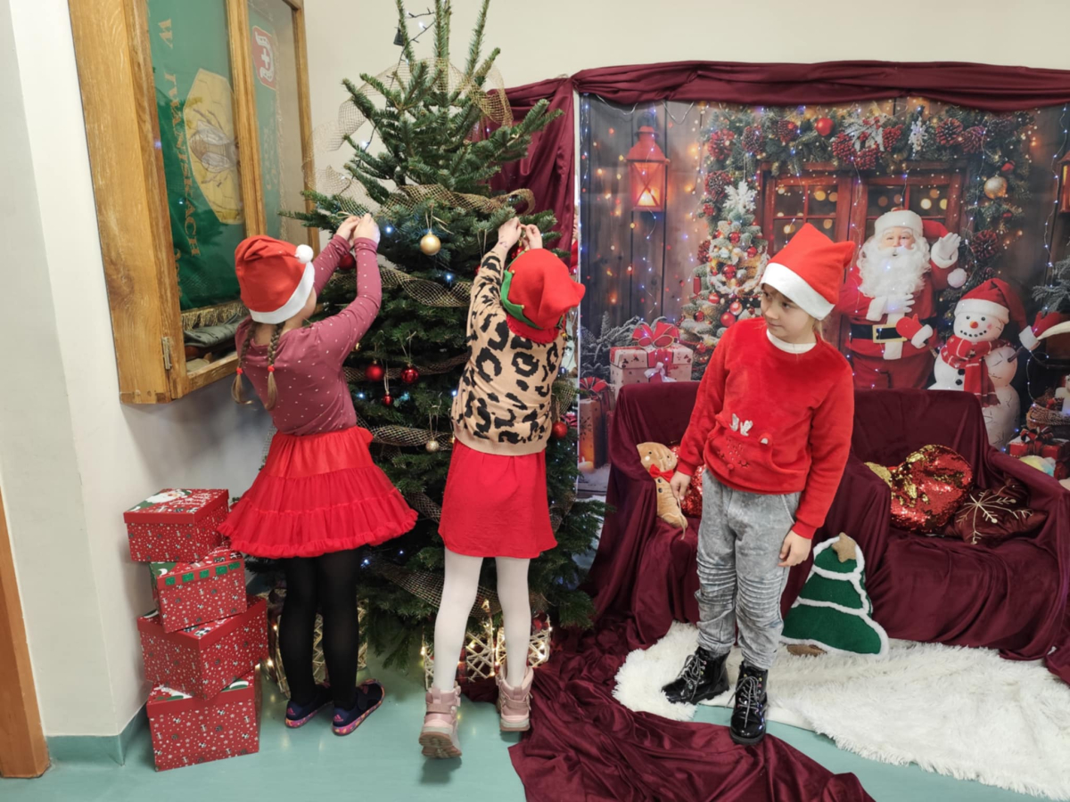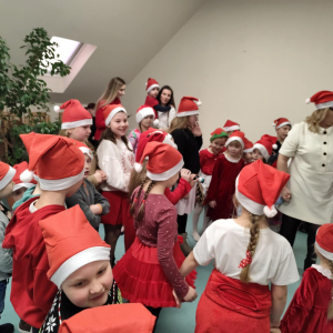 Dzieci przygotowały dla Mikołaja wzruszającą niespodziankę – zaśpiewały specjalnie dla niego świąteczną piosenkę. W tym samym czasie wspólnie wszyscy tańczyliśmy w kółku, tworząc piękny, pełen radości krąg świątecznej energii. Ten moment był prawdziwym sercem całego spotkania!