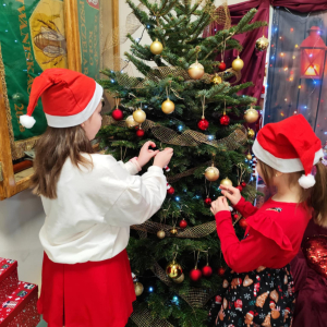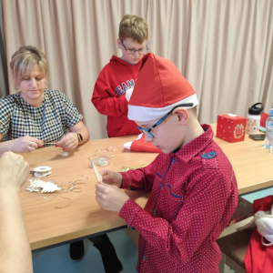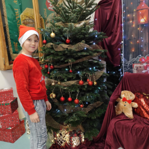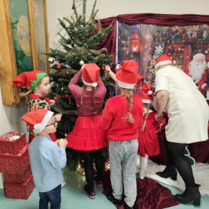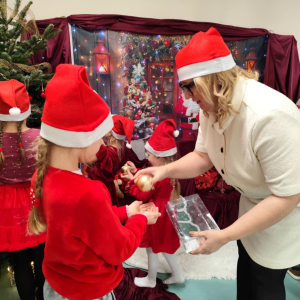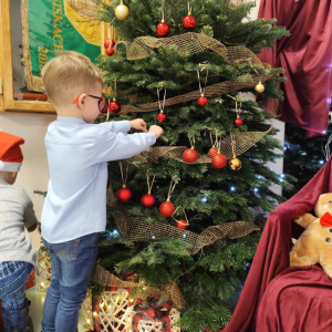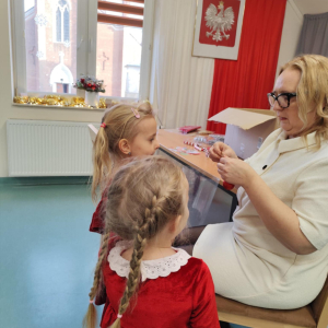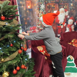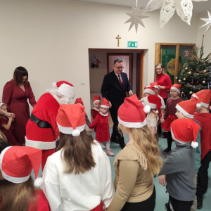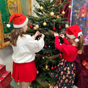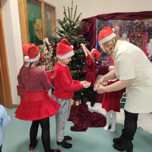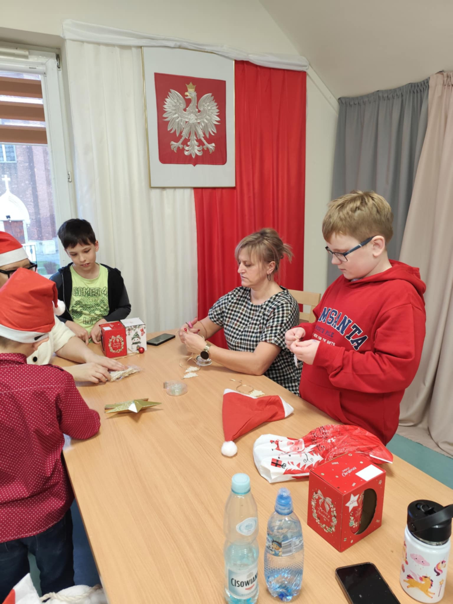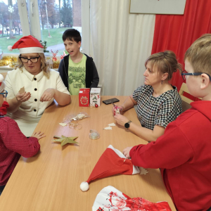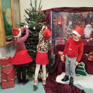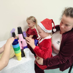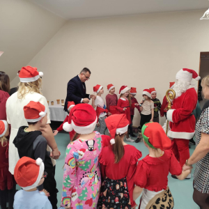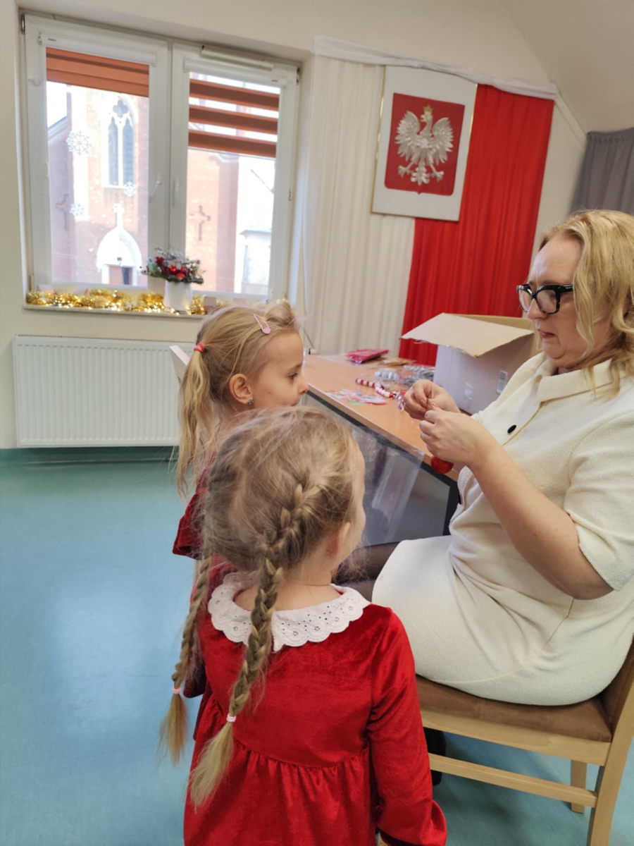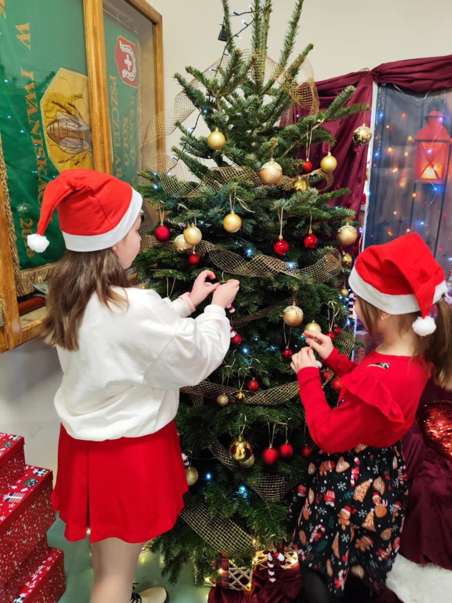 Dzieci przygotowały dla Mikołaja wzruszającą niespodziankę – zaśpiewały specjalnie dla niego świąteczną piosenkę. W tym samym czasie wspólnie wszyscy tańczyliśmy w kółku, tworząc piękny, pełen radości krąg świątecznej energii. Ten moment był prawdziwym sercem całego spotkania!