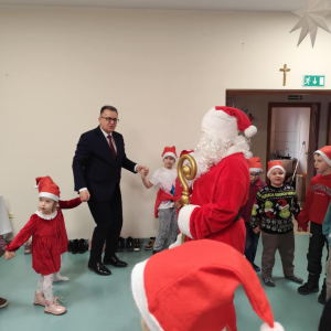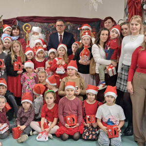 Następnie Mikołaj, wspólnie z Burmistrzem Miasta i Gminy Iwaniska Markiem Stańkiem oraz Dyrektor GCBiK w Iwaniskach Dominiką Kaptur, rozdali dzieciom świąteczne upominki. Uśmiechy i podekscytowanie najmłodszych były najlepszym dowodem na to, jak bardzo czekali na tę chwilę.